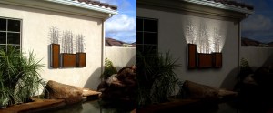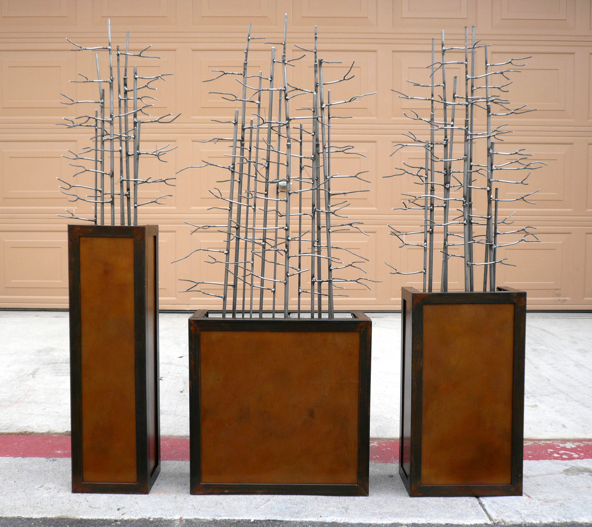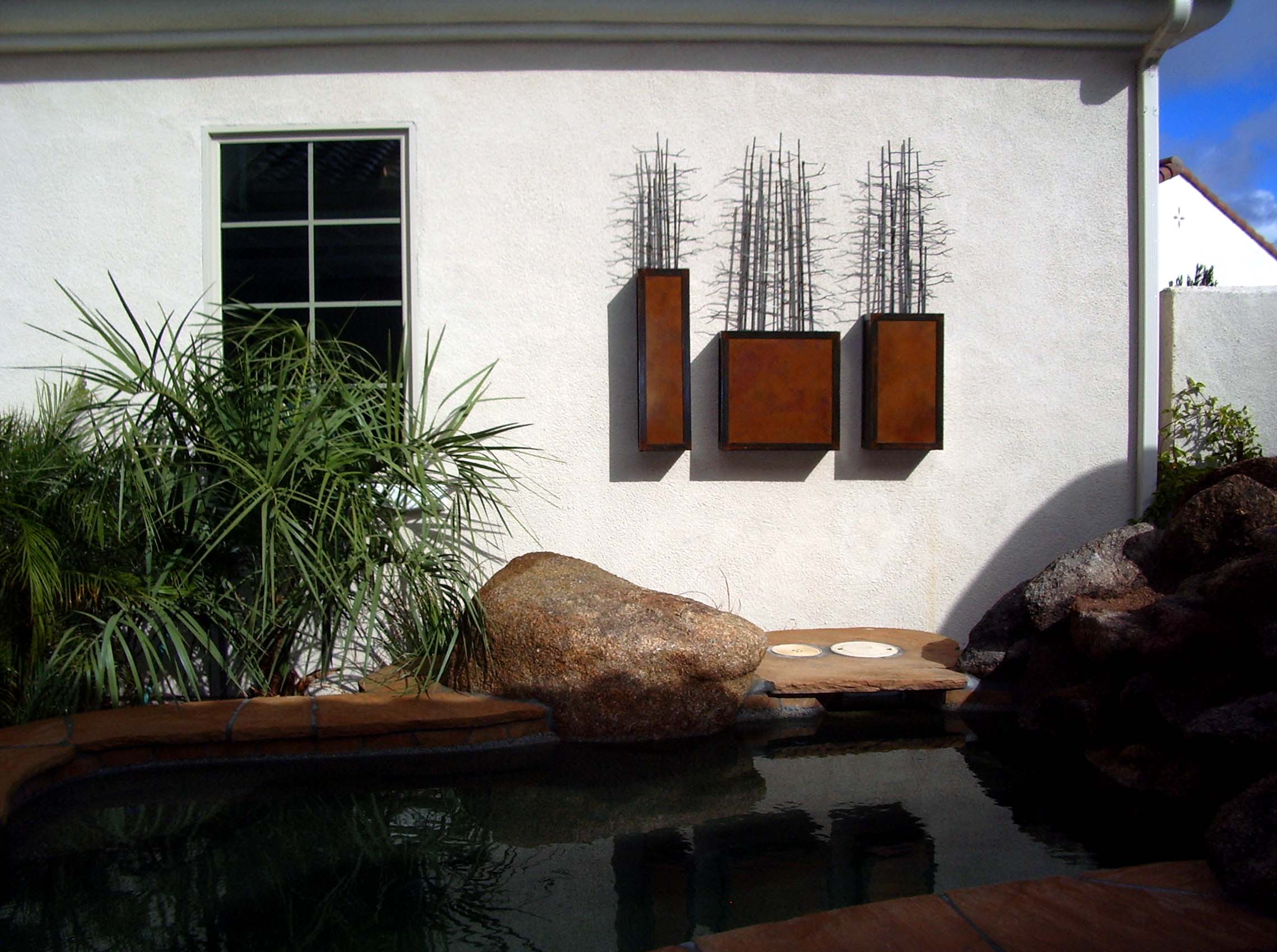 Wall Sculpture: This wall sculpture was commissioned to hang outdoors in the clients courtyard. It measures 52″x 50″x 6.5″, and is made of steel and copper treated with a patina finish. In addition, the piece is lit from inside each of the three rectangular sections.