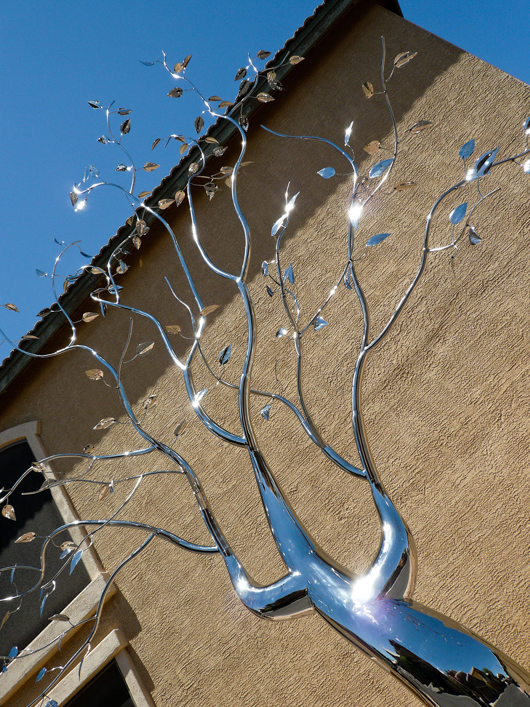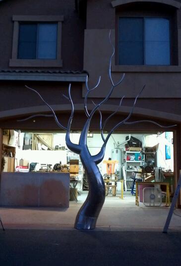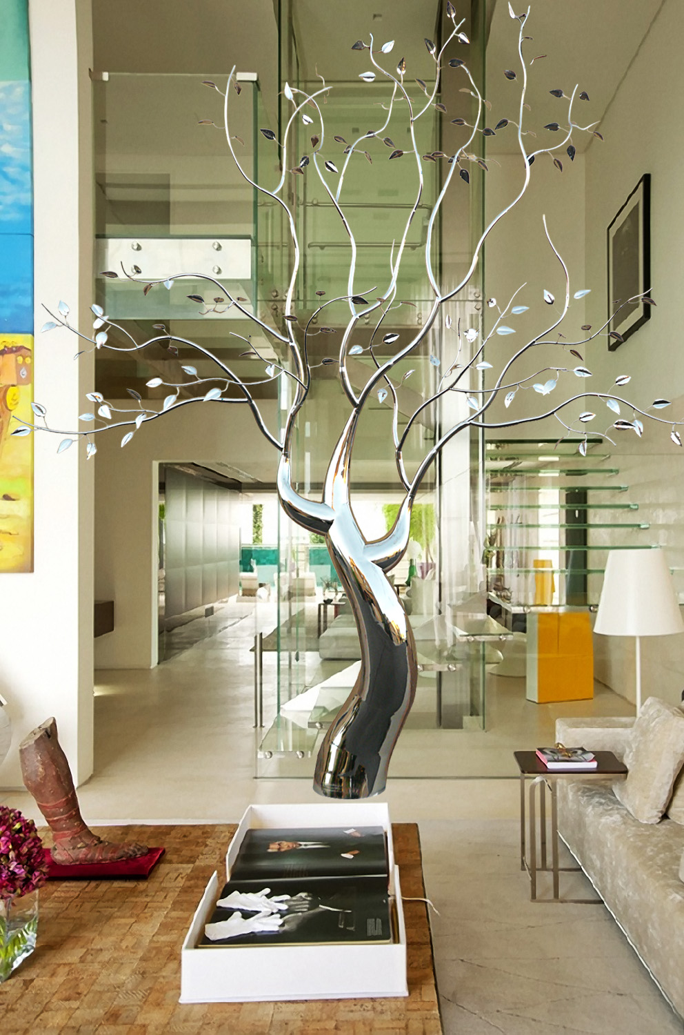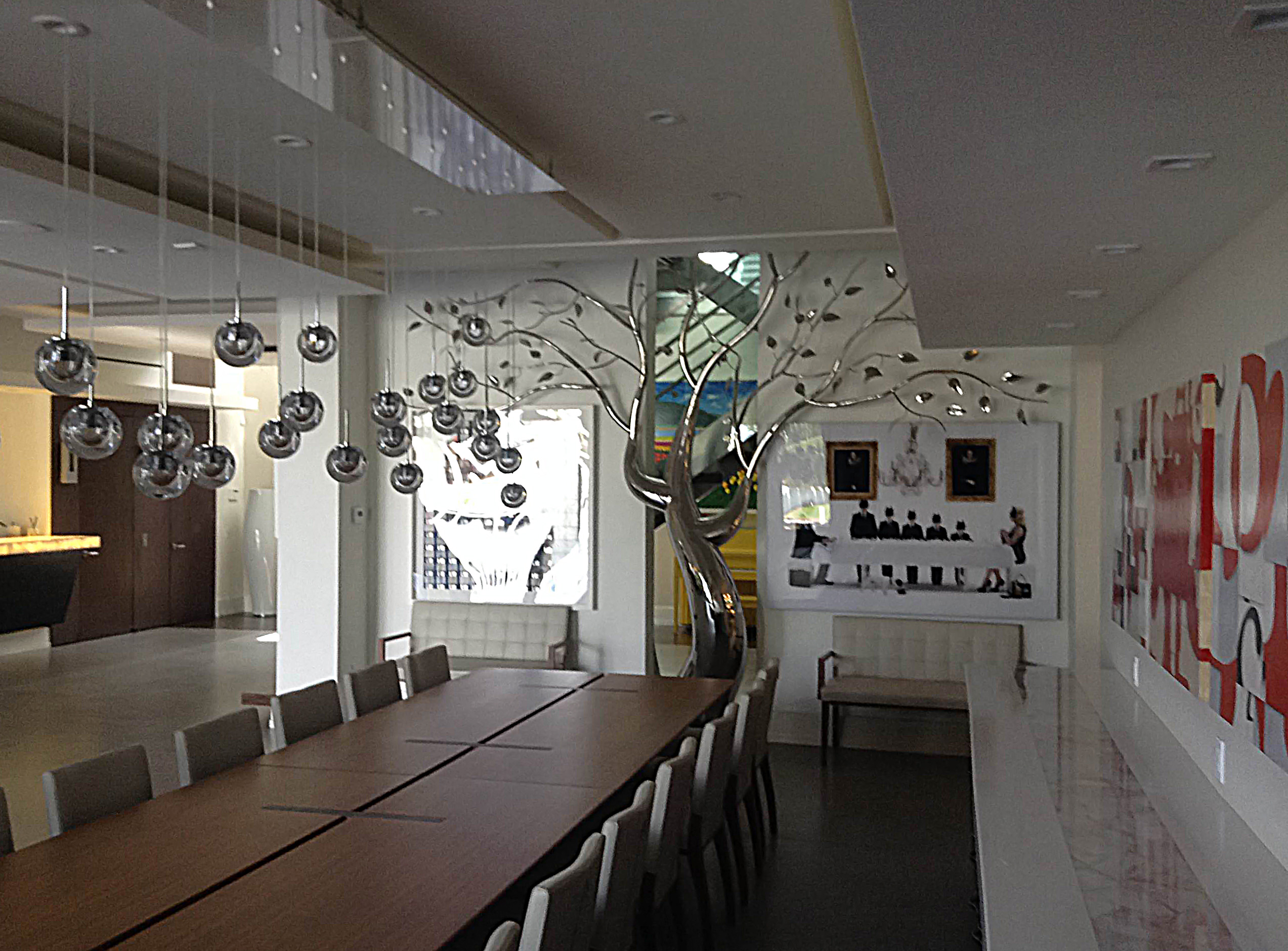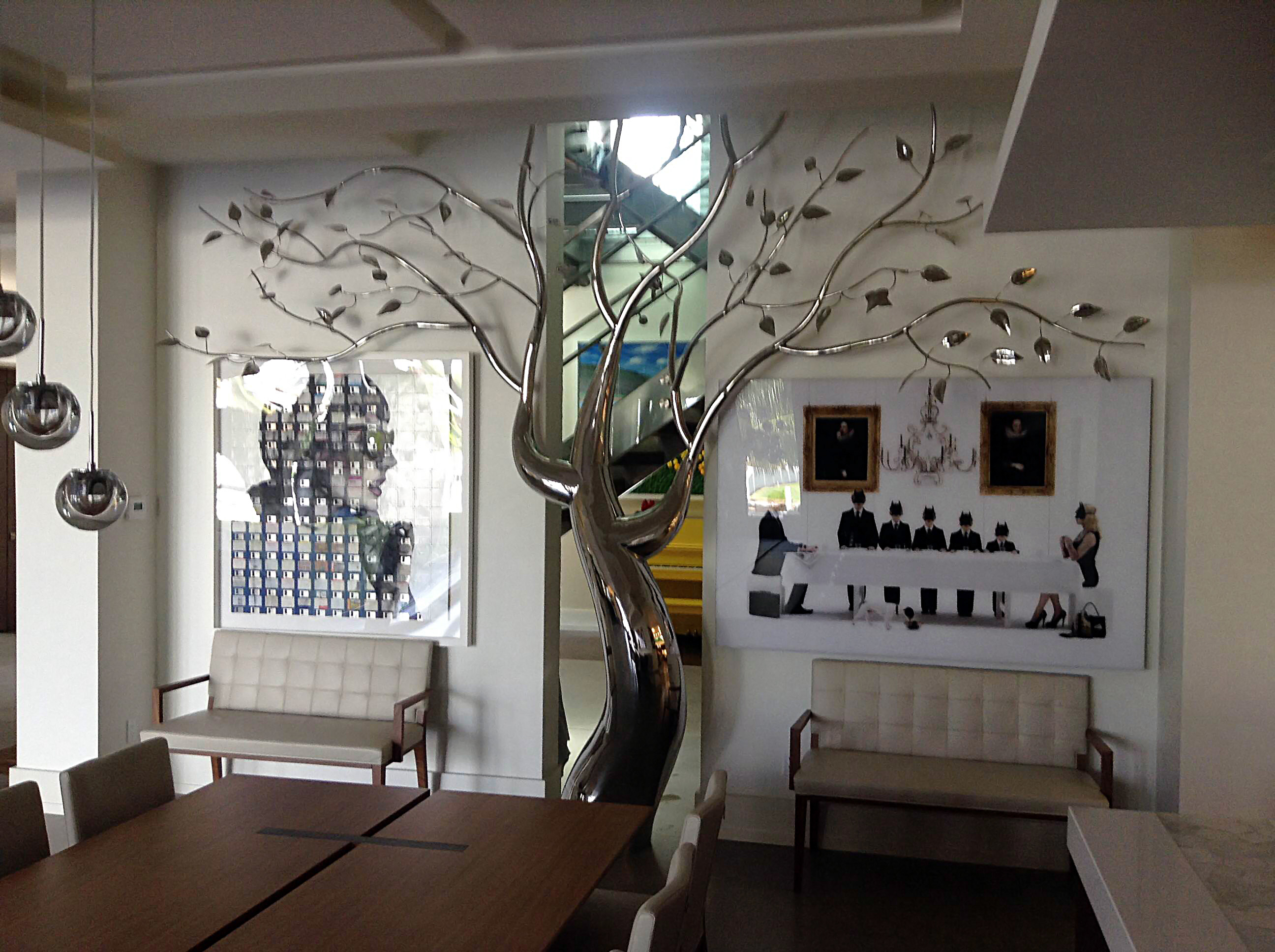 This piece was completed in the spring of 2012, and installed inside the South Beach FL home of Mr. Eyal Lalo, CEO of Invicta Watch Co. The entire sculpture was hand formed and fabricated from 304 stainless steel, and polished to a mirror finish. The piece stands approximately 16-17ft tall, and is 14-15ft wide. As seen from the images, the sculpture begins on the 1st floor and passes through an opening, approx. 12.5ft wide by 1.5ft deep in the 11ft ceiling above. The uppermost branches of the sculpture emerge into the second level in the space opposite the dinning room and can be viewed above, and as you move up, the glass and stainless steel staircase.