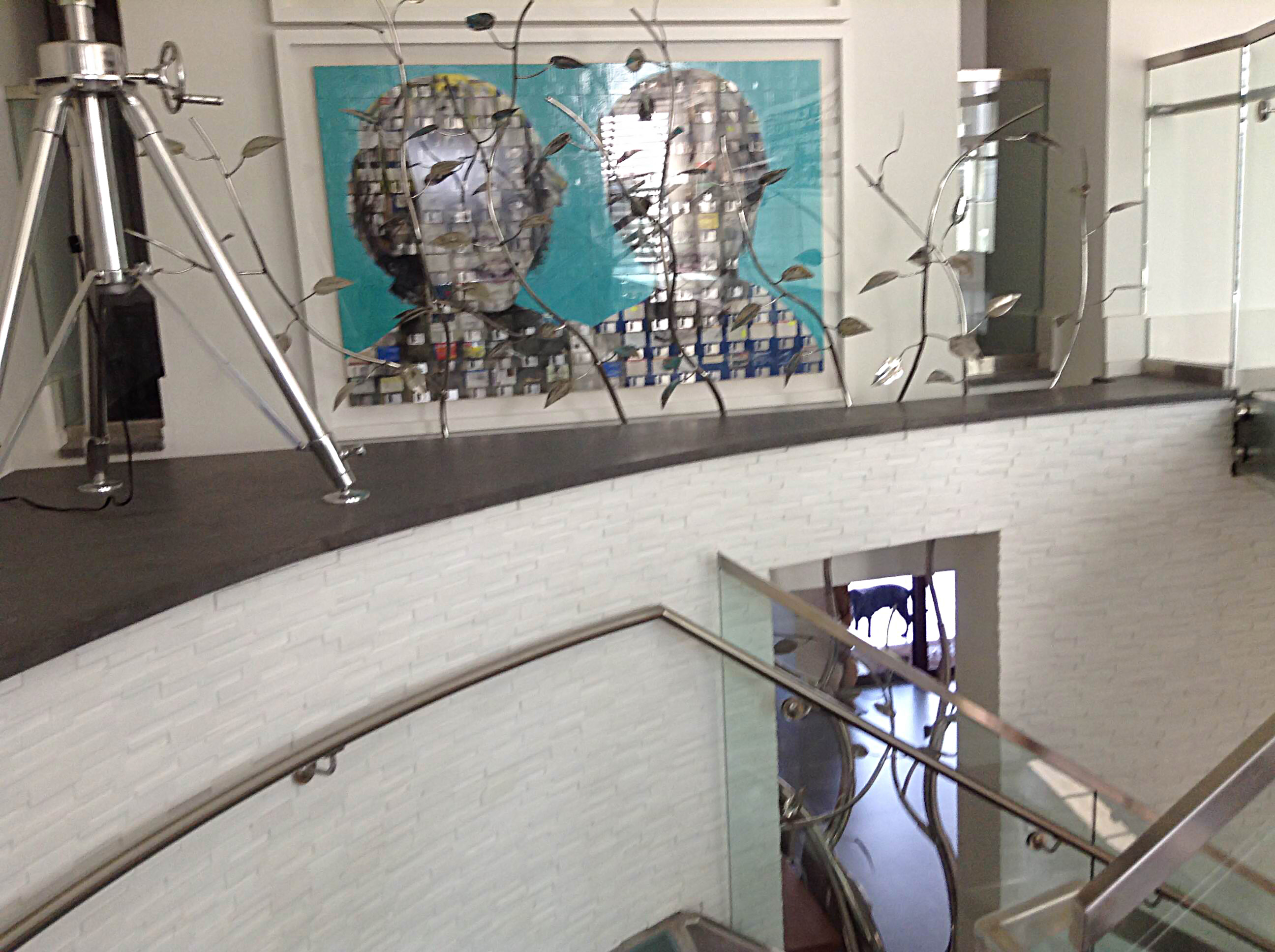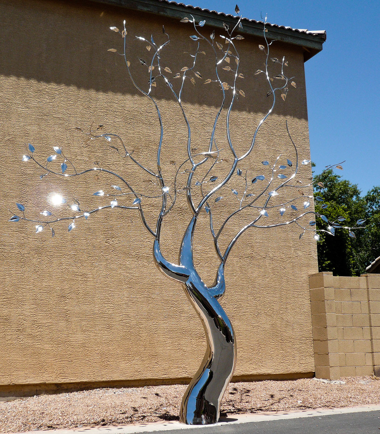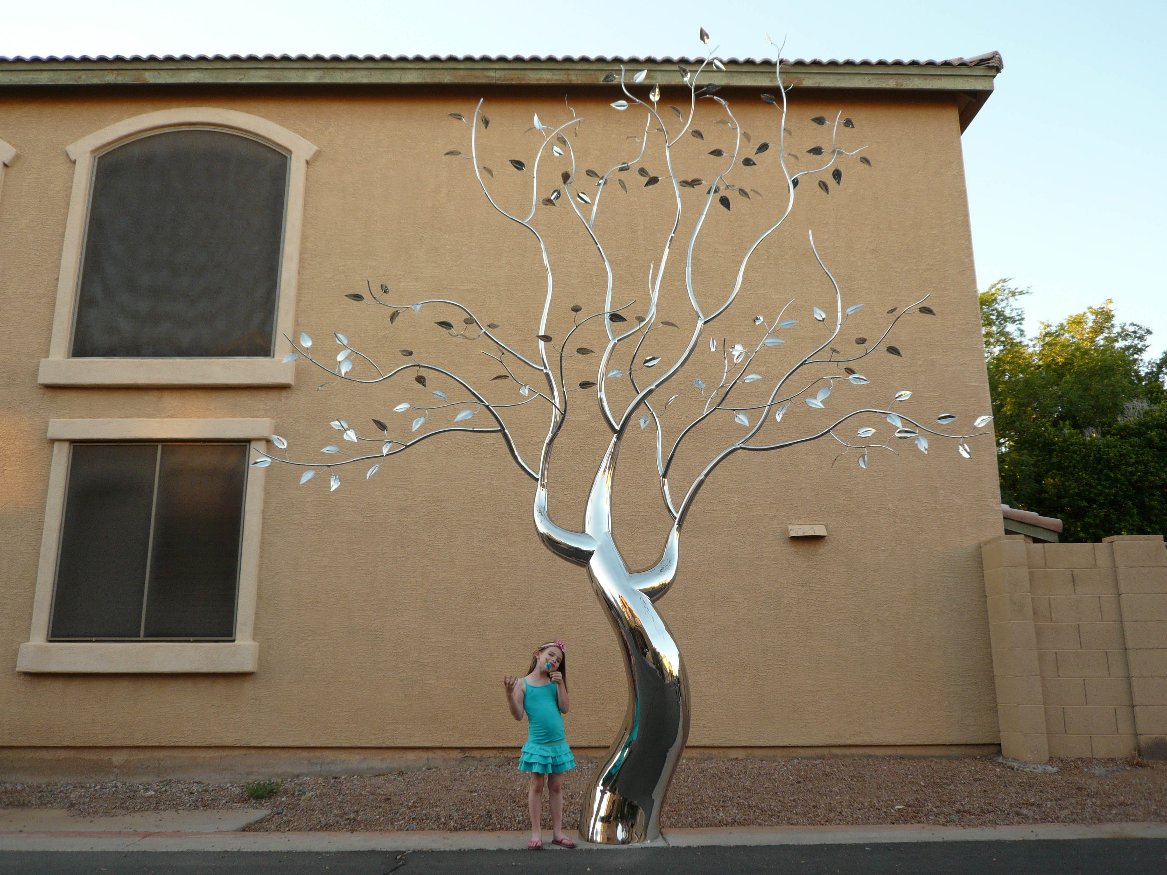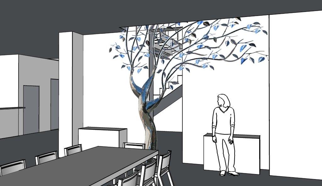 This piece was completed in the spring of 2012, and installed inside the South Beach FL home of Mr. Eyal Lalo, CEO of Invicta Watch Co. The entire sculpture was hand formed and fabricated from 304 stainless steel, and polished to a mirror finish. The piece stands approximately 16-17ft tall, and is 14-15ft wide. As seen from the images, the sculpture begins on the 1st floor and passes through an opening, approx. 12.5ft wide by 1.5ft deep in the 11ft ceiling above. The uppermost branches of the sculpture emerge into the second level in the space opposite the dinning room and can be viewed above, and as you move up, the glass and stainless steel staircase.