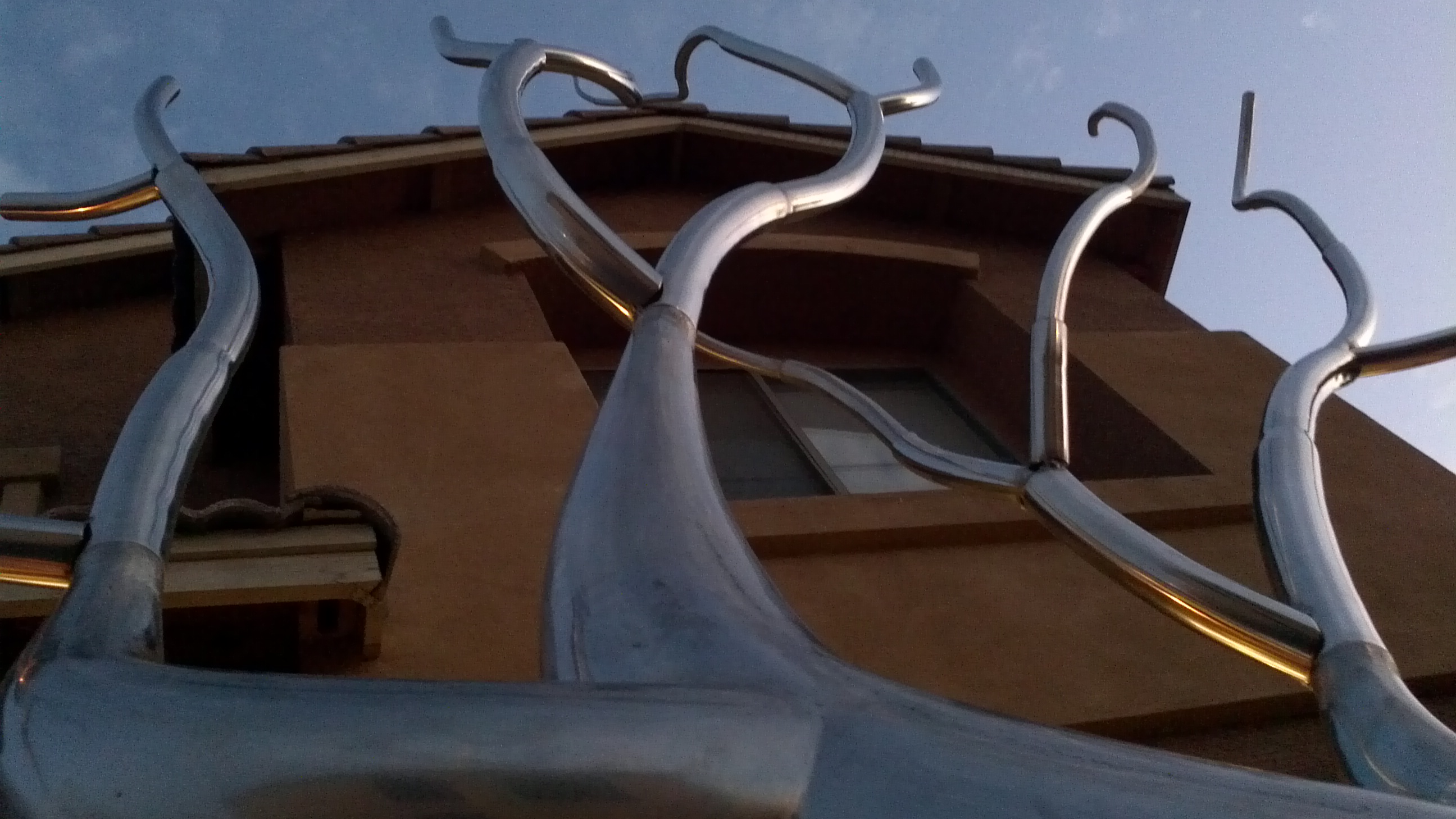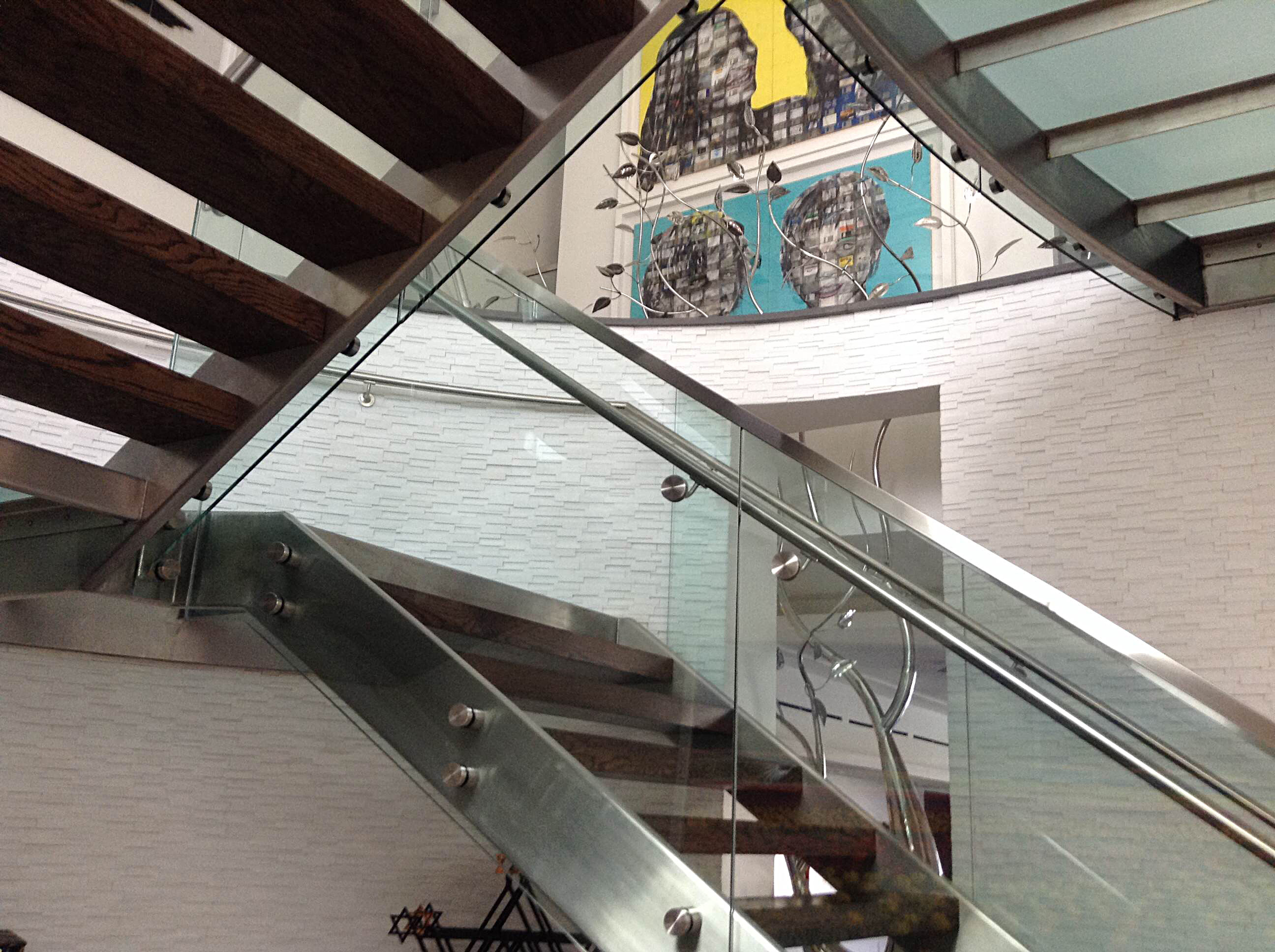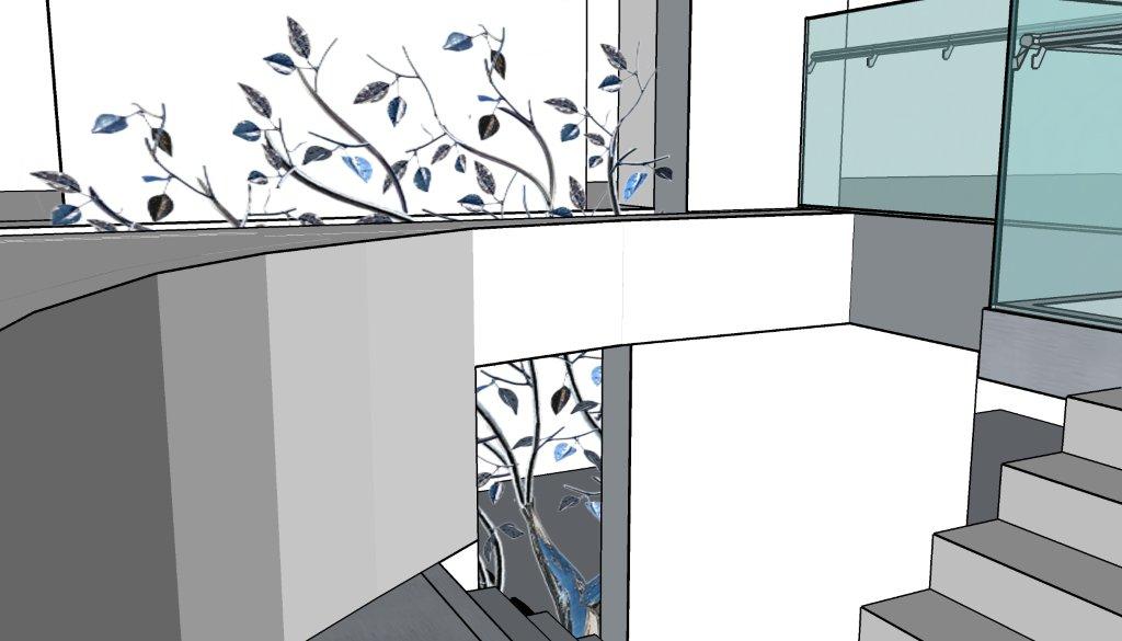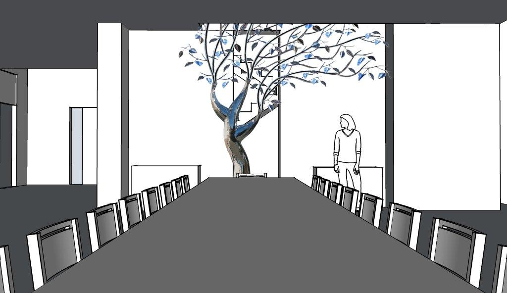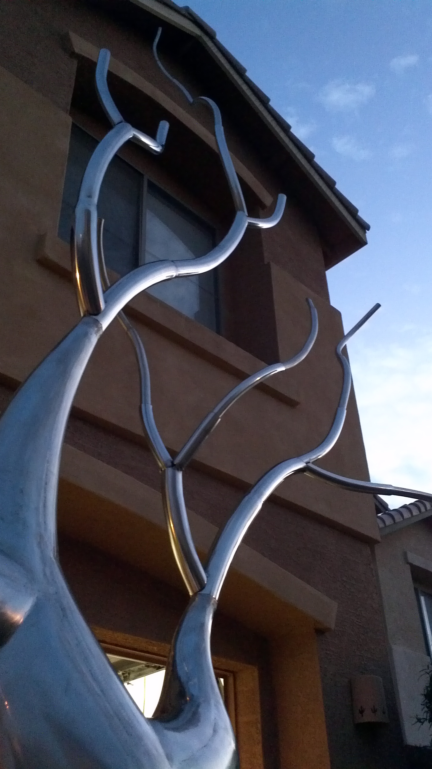 This piece was completed in the spring of 2012, and installed inside the South Beach FL home of Mr. Eyal Lalo, CEO of Invicta Watch Co. The entire sculpture was hand formed and fabricated from 304 stainless steel, and polished to a mirror finish. The piece stands approximately 16-17ft tall, and is 14-15ft wide. As seen from the images, the sculpture begins on the 1st floor and passes through an opening, approx. 12.5ft wide by 1.5ft deep in the 11ft ceiling above. The uppermost branches of the sculpture emerge into the second level in the space opposite the dinning room and can be viewed above, and as you move up, the glass and stainless steel staircase.